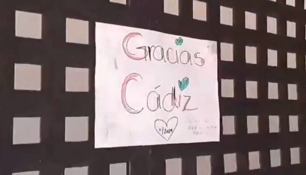 "Gracias Cádiz" se puede leer en un cartel colocado en la puerta de uno de los garajes que están siendo limpiados por los referidos bomberos.