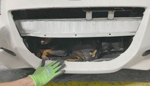 Tras una primera inspección, los funcionarios intervinientes comprobaron que el animal estaba consciente y que se hallaba en los bajos del motor del vehículo, por lo que realizaron varias maniobras para, con el máximo cuidado posible, retirar con éxito al can del habitáculo donde había quedado incrustado.