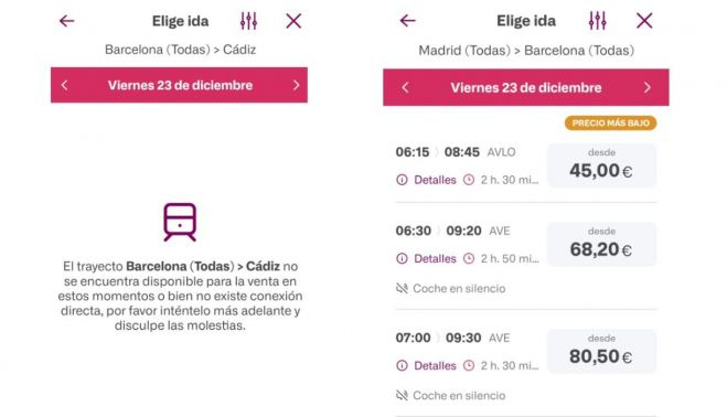 Mientras que para los desplazamientos a la capital de España hay, en menos de 45 minutos, dos AVE y un AVLO, para el trayecto Barcelona-Cádiz, como indica la propia Renfe, "no se encuentra disponible (billete) para la venta en estos momentos o bien no existe conexión directa, por favor inténtelo más adelante y disculpe las molestias”.