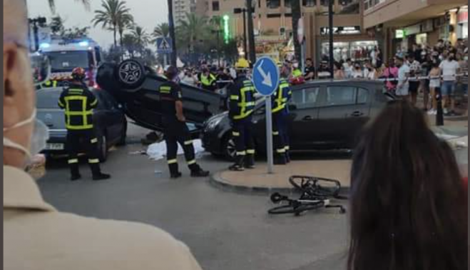 Un ciclista de 40 años falleció en la noche de este pasado lunes tras una colisión con tres turismos en la localidad malagueña de Fuengirola. Al parecer, según testigos presenciales, un coche de alta gama provocó el accidente múltiple. Era conducido, según las mismas fuentes, por tres jóvenes franceses a toda velocidad que acabaron arrollando al ciclista, derribando una palmera y un poste publicitario, y colisionando con otros vehículos.
