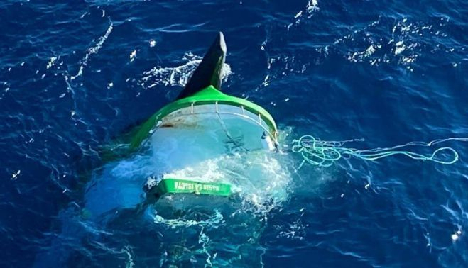 El hundimiento de su barco pesquero ha provocado la muerte de un pescador en Andalucía. Salvamento Marítimo alerta del accidente, mostrando una foto con la embarcación semihundida.