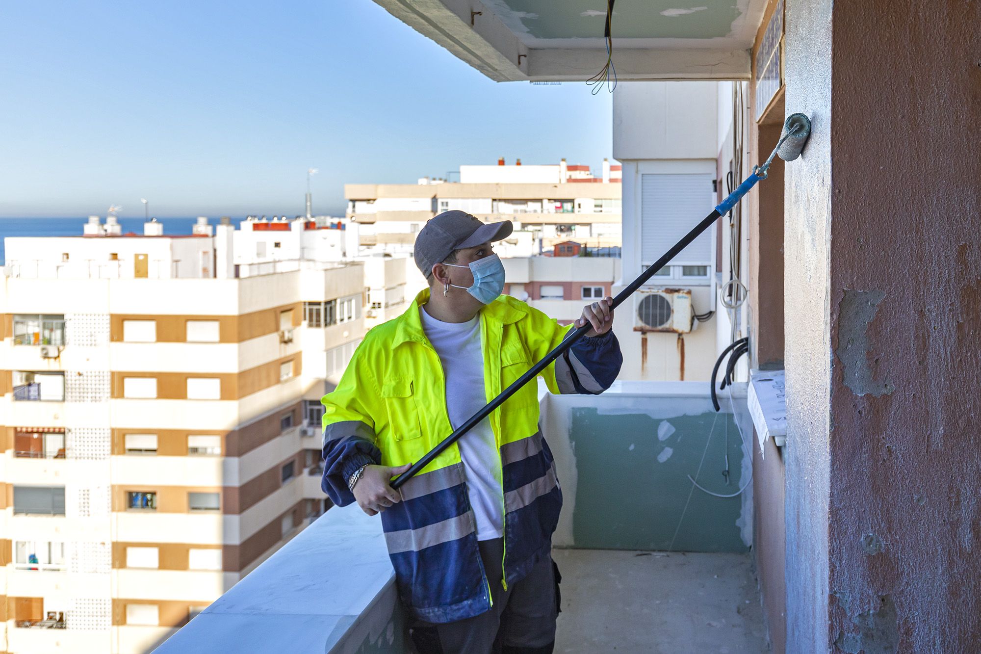 El fresco de la mañana se nota a más de 30 metros de altura. En la planta 11 de un edificio de la avenida José León de Carranza, en Cádiz, una mujer da perlita a una pared. La peona desliza el rodillo de arriba abajo en el interior de un piso particular que está en plena reforma. Rosa García, de 31 años, topógrafa, jefa de obra y soldadora, sigue aprendiendo los gajes de un oficio que siempre ha estado liderado por hombres.