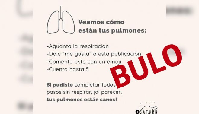 Es falso. Aguantar la respiración durante unos segundos no te permite saber si tienes o no coronavirus. Tampoco saber si se sufre una neumonía derivada del COVID-19. Se trata de un bulo que ha tomado fuerza en redes sociales en los últimos días, dentro de la comprensible necesidad de la gente de saber si tiene o no esta enfermedad.
