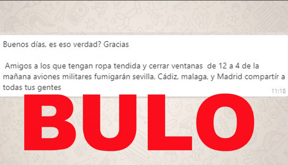 El jefe del Estado Mayor de la Defensa, Miguel Ángel Villarroya Vilalta, ha tachado de "rotundamente falso el bulo difundido en los últimos días" sobre la posibilidad de que se vaya a fumigar usando aviones, mientras que el Jefe del Estado Mayor de la Guardia Civil, el general José Manuel Santiago, ha alertado de que los bulos producen "estrés social".