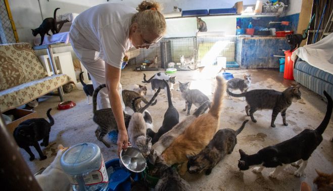 En la protectora de animales San Antón de Jerez, unos 120 ejemplares, entre perros y gatos, conviven en un refugio habilitado en un espacio alquilado. Ellos también sufren las inclemencias del clima. “Intentamos que tengan agua siempre muy fresca y evitamos que estén en el patio en las horas de máximo calor”, explica Maripaz Calderón, presidenta de esta asociación que nació en 2011 y ha llegado a acoger hasta caballos. En la actualidad, un equipo de voluntarios cuida a perros y gatos con mucho esfuerzo. “Nos cuesta mucho sacar este refugio adelante”, confiesa.