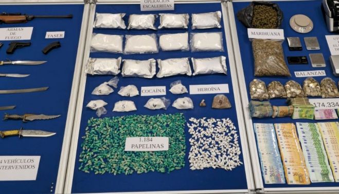 En total, se han incautado 174.334 euros en metálicomás de un kilo y medio de cocaína y un kilo de heroína, 585 gramos de marihuana y cien de hachís, además de las armas indicadas, se ha intervenido siete balanzas de precisión, útiles de manipulación de droga, cuatro vehículos de alta gama y numeroso material eléctrico para el cultivo de marihuana. La operación sigue abierta y no se descartan nuevas detenciones