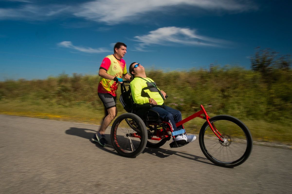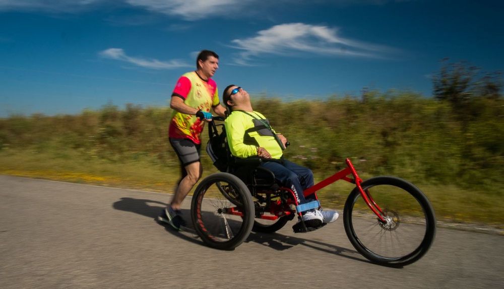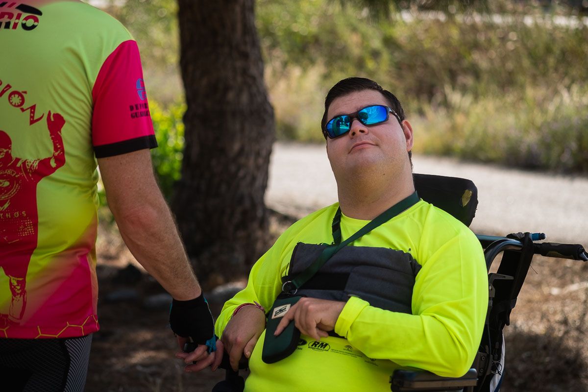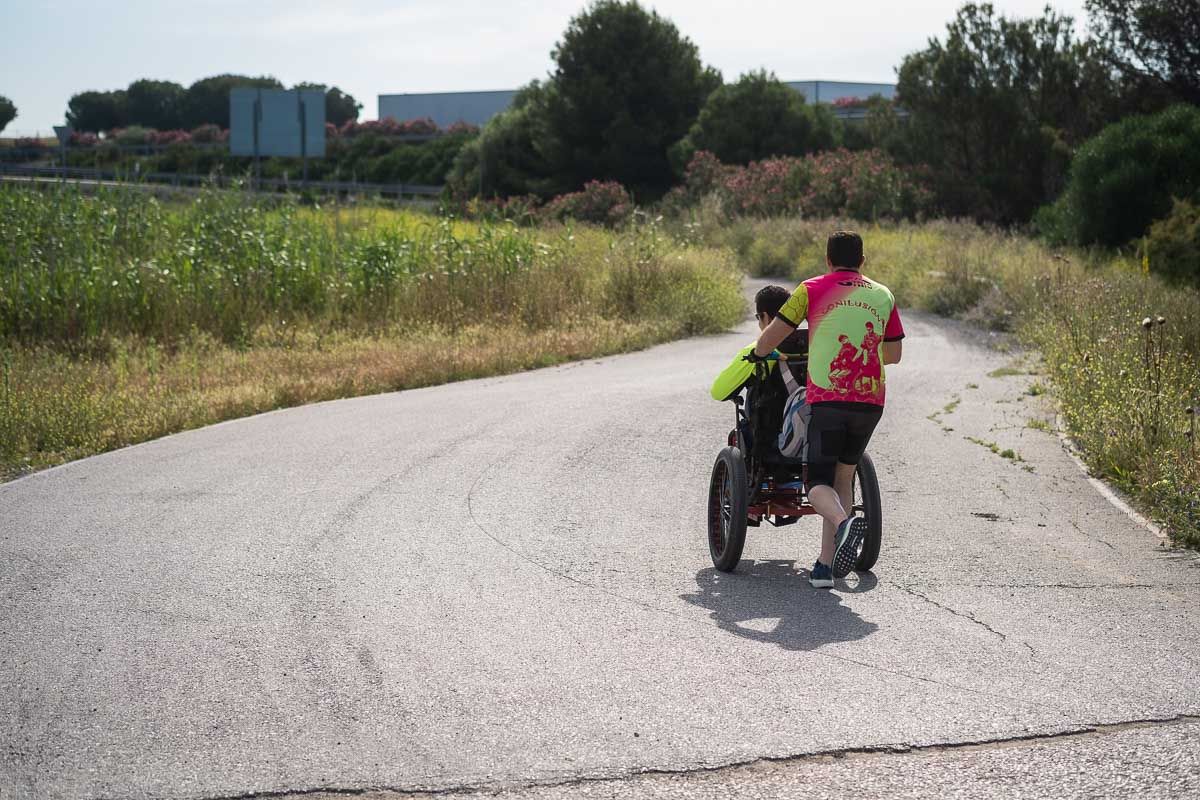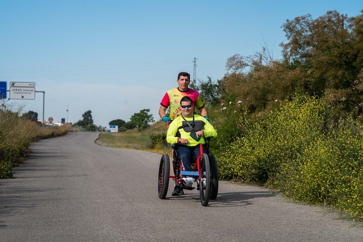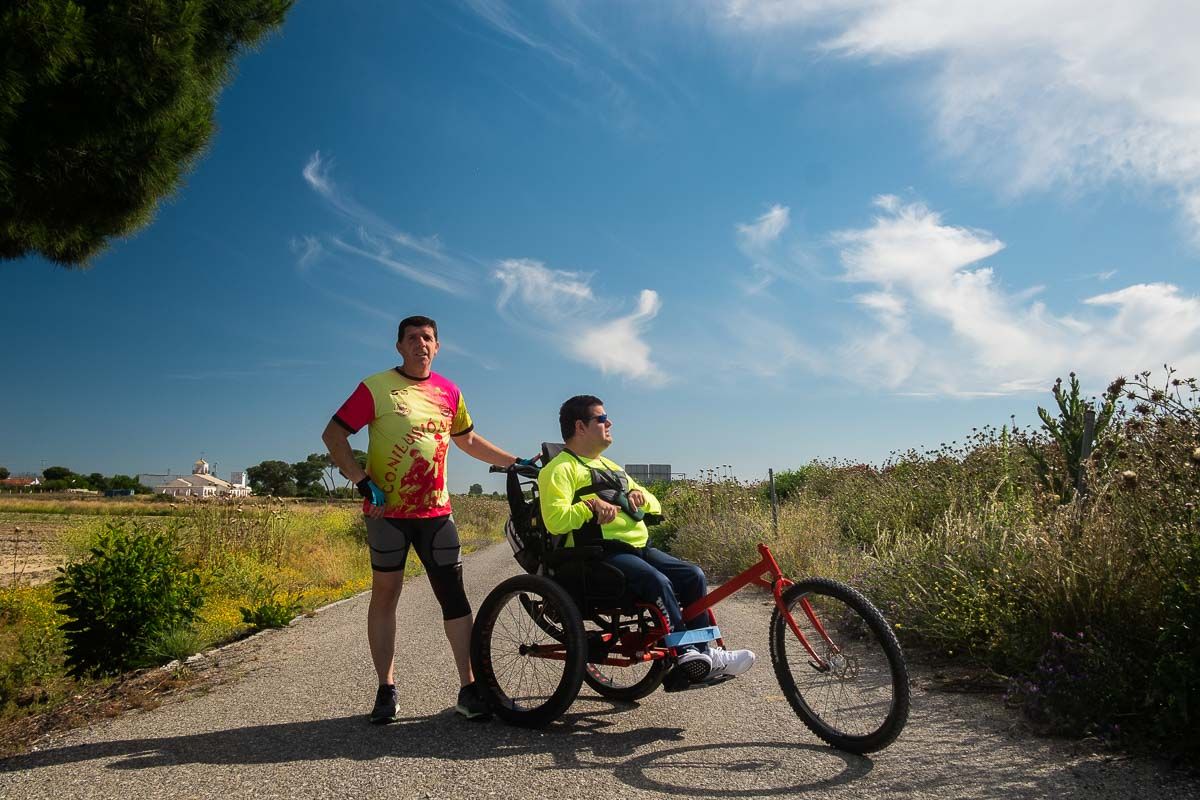 Pasan las diez de la mañana cuando Óscar y Juan salen de su casa, en Guadalcacín, una Entidad Local Autónoma de Jerez, listos para volver a entrenar. No lo hacen desde que se decretó el confinamiento. Durante 66 largos días han estado sin hacerlo. Pero hoy vuelven a pisar el firme y a respirar aire fresco. Juan García es el padre. Para la ocasión, se enfunda una camiseta de colores chillones, amarilla y rosa, en la que se intuye su silueta y la de su hijo, en una reproducción de la foto que les tomaron cuando concluyeron la primera prueba que disputaron. Óscar viste amarillo flúor, lleva gafas de sol de espejo y va en su silla de ruedas roja, adaptada, con ruedas de bicicleta de montaña.