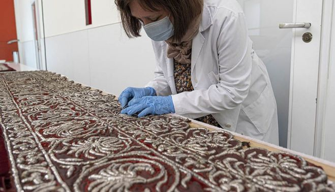 Con el fin de mantener esa funcionalidad y, por tanto, uno de sus más importantes valores, así como garantizar su conservación en el futuro, los profesionales del Taller de Tejidos y del Área de Laboratorios del Instituto Andaluz del Patrimonio Histórico están trabajando de forma conjunta en el desarrollo de una técnica que permita, de un lado, frenar las patologías detectadas y, por otro, permitir la reintegración volumétrica del terciopelo, cuya pérdida salta a la vista en amplias zonas del techo y de las bambalinas del palio.