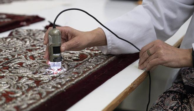 "En los laboratorios estamos sometiendo los materiales proporcionados por el taller de tejidos a una serie de experimentos de envejecimiento acelerado, es decir, a condiciones extremas de temperatura, humedad relativa y radiación ultravioleta, con el fin de estudiar y evaluar el comportamiento futuro", explica la ingeniera química Cristina García Garrido. "Queremos conocer la variación en propiedades físicas y mecánicas de estos materiales ‒el color o la resistencia a la tracción y el desgarro, por ejemplo‒ antes de intervenir en el palio", recalca Marta Sameño, directora de Investigación y Transferencia del IAPH.