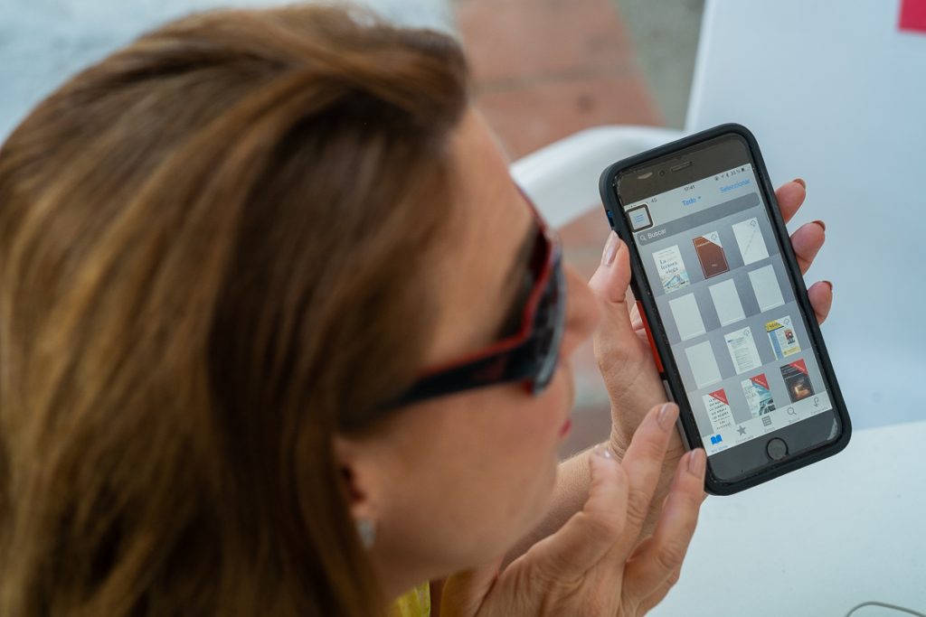 La autora de 'La lectora ciega' enseña a lavozdelsur.es una 'app' que le permite leer obras literarias. FOTO: MANU GARCÍA.