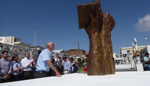 Un momento del homenaje a los represaliados en Paterna.Las cajas se alojaron en la base del monolito emplazado justo donde existía la fosa común. Sobre el basamento se erigen dos manos de bronce esculpidas por Jesús Cuesta Arana: una masculina con el puño cerrado y una femenina sujetando un libro. Una alegoría sobre “el vigor, la fuerza… pero también la libertad”, en palabras de su autor. En la parte frontal se inserta una placa con una reflexión de José Saramago: “Somos la memoria que tenemos y la responsabilidad que asumimos, sin memoria no existimos y sin responsabilidad quizás no merezcamos existir”.