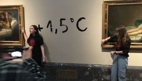 Dos activistas ecologistas se han pegado este sábado al marco de La maja desnuda y de La maja vestida de Francisco de Goya en el Museo Nacional del Prado en Madrid. La Policía, pertenecientes al colectivo Futuro Vegetal, se las llevó después de que escribieran en la pared el mensaje de '+1,5º' para "alertar sobre la subida de temperatura mundial que provocará un clima inestable y graves consecuencias en todo el planeta".