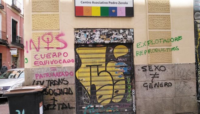 Entre las acusaciones pintadas en la fachada del Centro Asociativo Pedro Zerolo, en el entorno del madrileño barrio de Chueca, se encuentran las de "Explotadores reproductivos", "Compra bebés", "Ley Trans es misoginia y capitalismo" junto a la firma Rad Fem.