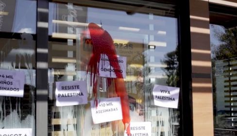 Con pintadas rojas simulando sangre y carteles en los que se podía leer "resiste Palestina" o "más de 4.000 niños asesinados", este grupo que se define como "un colectivo de desobediencia civil no violenta" ha pedido el boicot a McDonald's. "Basta de alimentar el genocidio", han señalado.