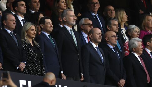 Otro de los elementos destacados de esa previa fue la presencia de Su Majestad el Rey Felipe VI, que acudió al partido junto al presidente de la Junta de Andalucía, Juanma Moreno. La imagen de ambos en el palco reforzó el peso institucional de una final que, una vez más, quedó acompañada por una fuerte carga simbólica.