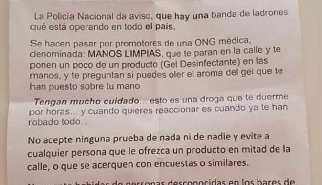 La Policía Nacional confirma a La Voz del Sur que "no existe ninguna organización que use gel desinfectante para dejarte dormido y posteriormente robarte en la vía pública o en casa. Hay que dejar claro que no hay gente por la calle durmiendo con gel a nadie, ni tampoco en las puertas de las casas".