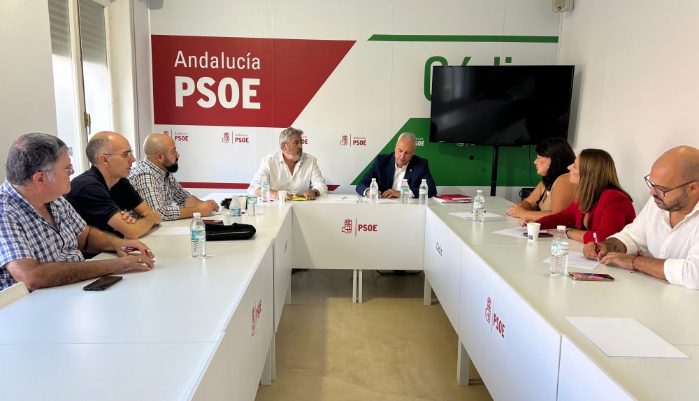 El secretario general del PSOE de Cádiz y diputado en el Congreso, Juan Carlos Ruiz Boix, junto a la secretaria de Organización, Ana Carrera, la portavoz en Puerto Real, Elena Amaya, y el secretario general del PSOE en Puerto Real, Carlos Salguero, han mantenido en la mañana de este viernes un encuentro con representantes del comité de empresa de Navantia de Puerto Real liderados por el presidente del comité intercentros, Arturo Martínez, en la que los socialistas gaditanos se han comprometido a trasladar al Gobierno de España la necesidad de garantizar a futuro la continuidad de la construcción naval en la factoría de Matagorda.