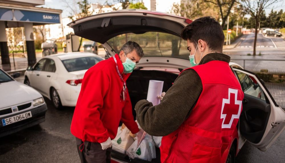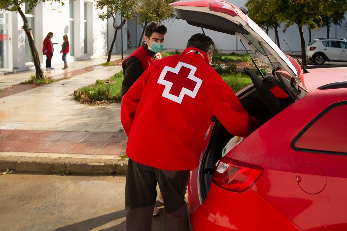 Quini llega con la mascarilla y los guantes puestos, saluda con el codo, y entra en las instalaciones de Cruz Roja en Jerez para conocer el itinerario del día. Hoy tiene cuatro domicilios a los que acudir. Lo acompaña su hijo Mario, que llega unos minutos más tarde, por separado, también ataviado con el correspondiente material de prevención. Los dos, padre e hijo, forman parte del programa de voluntariado de la organización que, durante el confinamiento, lleva comida y medicamentos a personas mayores o que pertenecen a un grupo de riesgo ante el coronavirus. Antes de montarse en el coche hay que asegurarse de que está todo. Cada usuario tiene unos alimentos asignados, dependiendo de sus necesidades. El maletero está a rebosar y la ruta, clara.