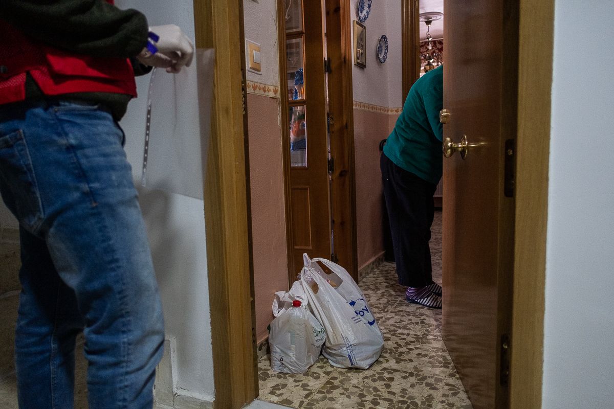 La primera parada de Joaquín —Quini para los amigos— y Mario Rodríguez es en el polígono San Benito. En el cuarto piso de un bloque de viviendas está esperando María José, una octogenaria que prefiere no dar su verdadero nombre ni que se le vea la cara. “La cara no, hijo”, le dice al fotógrafo. Ella vive sola con su marido, que padece Alzheimer, y a cuyo cuidado dedica la mayor parte del día. Hace años que colabora con Cruz Roja, abonando una cuota mensual. “No los he buscado, me han llamado ellos a mí”, relata María José, quien agradece la comida y los minutos de charla. “Ayudar a los demás me ha gustado siempre”, dice ella, que tiene una amplia trayectoria como voluntaria en la iglesia de su barrio.