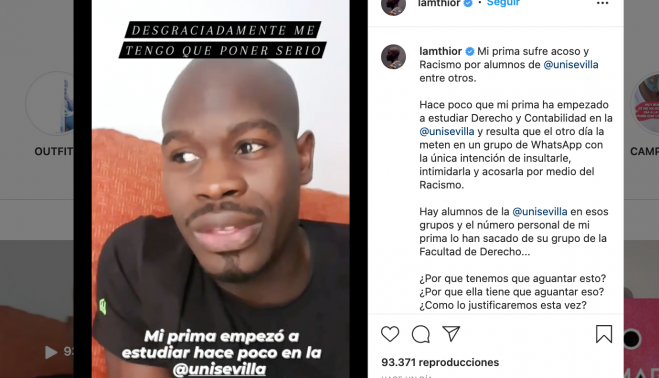 "Mi prima sufre acoso y racismo por alumnos de Universidad de Sevilla entre otros", asegura el actor y cómico Lamine Thior, en sus redes sociales. "Hace poco que mi prima ha empezado a estudiar Derecho y Contabilidad y resulta que el otro día la meten en un grupo de WhatsApp con la única intención de insultarla, intimidarla y acosarla por medio del racismo", relata.