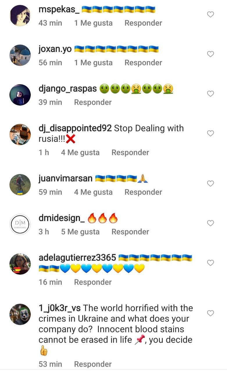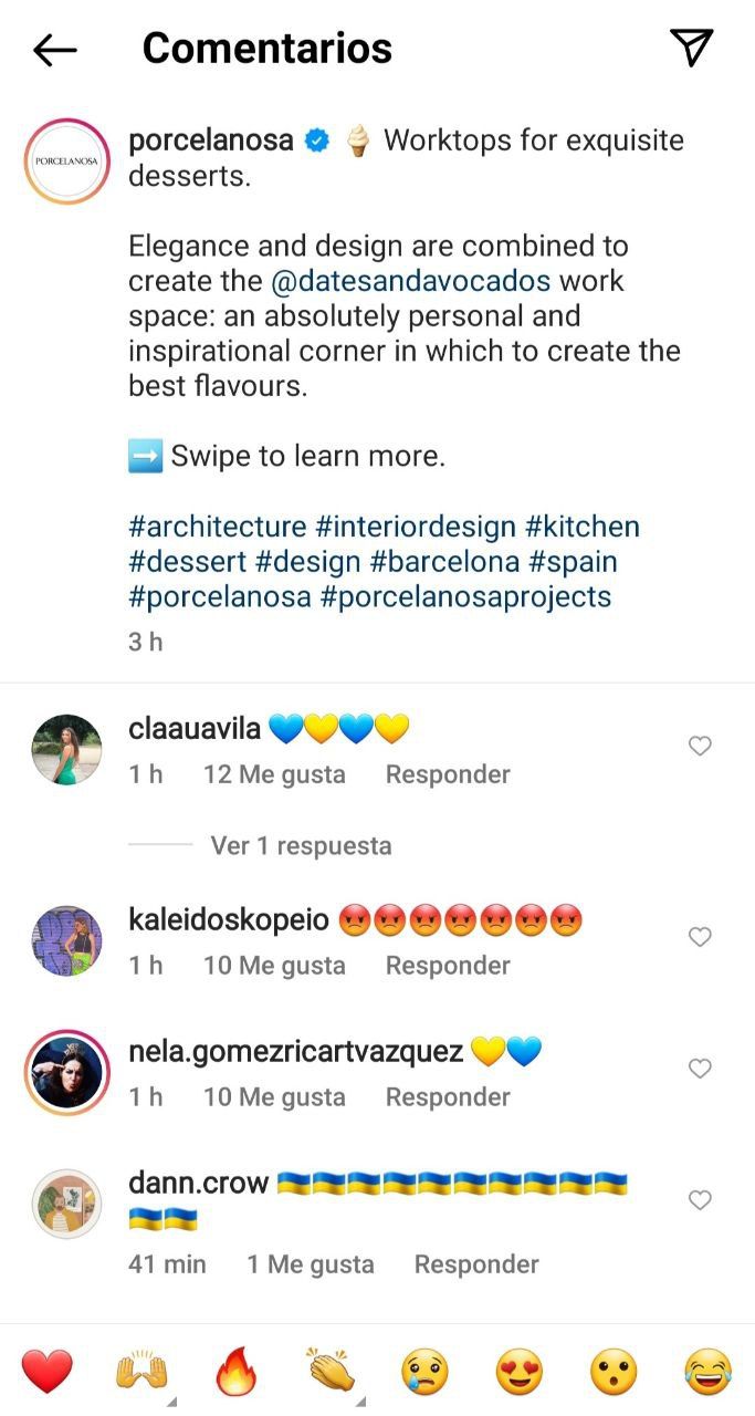 Inmediatamente, los perfiles en redes sociales de Porcelanosa se han llenado de críticas hacia la empresa hasta el punto de que la compañía ha tenido que improvisar un comunicado justificando sus operaciones y afirmando que han bloqueado "la totalidad de transacciones comerciales con Rusia". En Instagram, los usuarios han puesto una infinidad de banderas de Ucrania para apoyar la comparecencia de Zelenski.