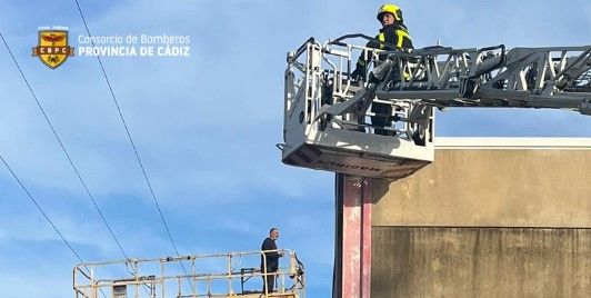 Los bomberos han rescatado a una persona en una maquina elevadora pegada a un cable de alta tensión en el polígono industrial el Portal, en la calle Sudáfrica de Jerez de la Frontera