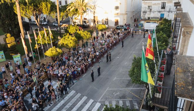 Doce banderas de España ondean al viento frente al Palacio Reynoso de Mendoza, antigua casa de cargadores de indias que fue sede del antiguo Ayuntamiento. Todavía faltaba más de una hora y media para que el rey Felipe VI se bajara del coche, pero en la plaza del Polvorista de El Puerto, aferrados a las vallas, ya se veían a algunos vecinos. El café Sanluca estaba a rebosar. Varias generaciones se han unido por un mismo motivo: ver al Borbón en vivo y en directo.