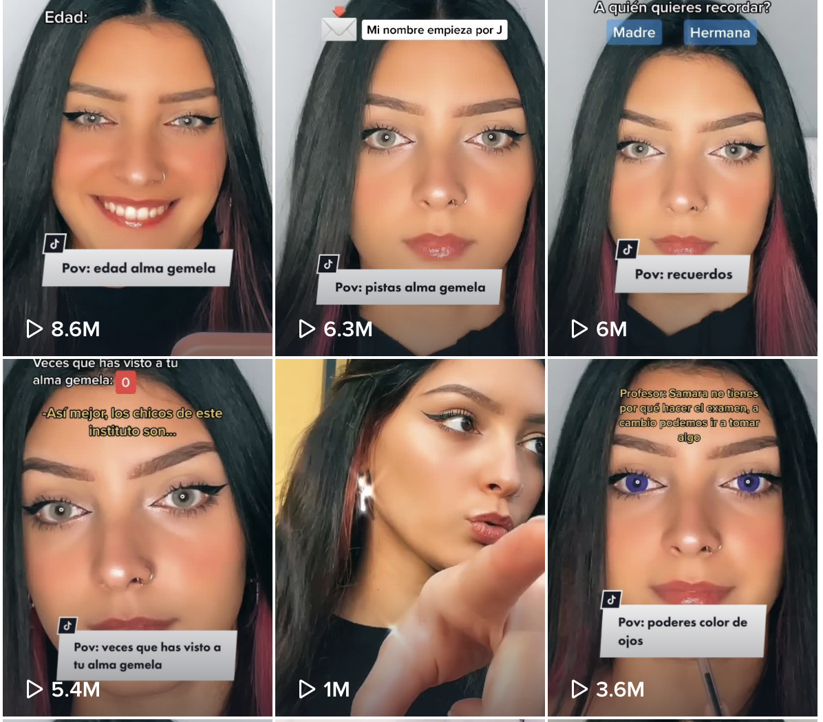 ¿Qué hace Samara en TikTok? "Son como minihistorias, hago como un guion, me baso en una película que he visto, en una serie, en libros que leo, y hago un guion como si fuera una pequeña historia resumida en un minuto; ya luego grabo las voces, grabo el vídeo y básicamente es eso. La gente ve una serie en pequeños capítulos". En TikTok, según cuenta, "hay de todo, gente que baila, que hace comedia, que cuenta su vida, que canta... es como YouTube pero con vídeos que van de 15 segundos a un minuto como máximo". Samara aprovecha sus microhistorias de una superheroína en busca de almas gemelas y, por ejemplo, inventa super poderes con las lentillas de colores que le mandan diferentes fabricantes. Exhibe ropa de marcas internacionales o se pone el maquillaje que le envían. También hace sorteos. Al día, este trabajo, porque lo es, le ocupa unas 3-4 horas, aunque a veces se pasa el día entero "pensando qué historia subir".