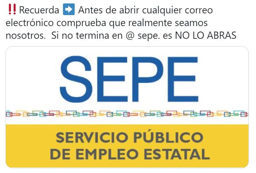 ‼️Recuerda ➡️ Antes de abrir cualquier correo electrónico comprueba que realmente seamos nosotros. Si no termina en @ sepe. es NO LO ABRAS pic.twitter.com/JP1vBMIbS6