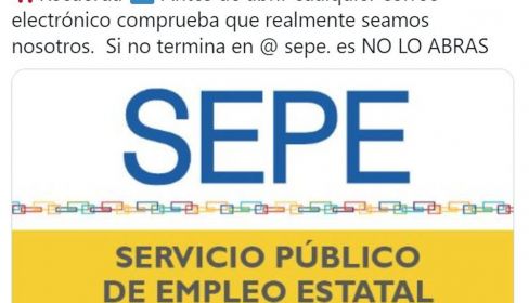 El SEPE ha publicado en sus redes sociales un post en el que avisa de este fraude tras observar las denuncias. "Recuerda: Antes de abrir cualquier correo electrónico comprueba que realmente seamos nosotros", ha explicado en Twitter. Además, el organismo público señala que los usuarios deben fijarse bien en la dirección del correo electrónico y "si no termina en '@sepe.es', no lo abras".
