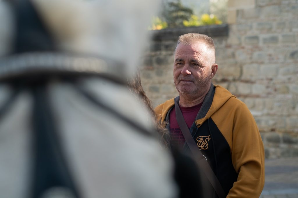 “El día a día de un cochero es muy duro”, explica Francisco Pacheco. “A las siete de la mañana tenemos que estar ya en la cuadra, hay que limpiar al caballo, darle de comer y de beber, limpiar la guarnición, limpiar el coche, enganchar el coche y venir al centro de Jerez para estar aquí ya sobre las ocho y media o las nueve de la mañana”. En el centro de Jerez echan entre diez y doce horas, “aunque no ganemos nada, pero tenemos que estar aquí”, porque no se vuelven a sus casas para comer, sino que se quedan a comer por el casco histórico. Una vez que termina la jornada laboral, sobre las siete u ocho de la tarde, el cochero vuelve a casa, desengancha el coche, lleva el caballo a la cuadra, le echa de comer, lo prepara para la noche y al día siguiente vuelta a empezar.