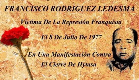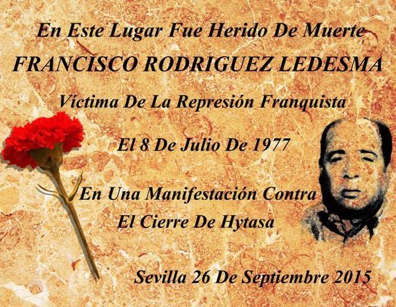 El colectivo cultural Aire Libre de Sevilla pide que se señalice en la avenida de Hytasa el lugar de memoria dedicado a Francisco Rodríguez Ledesma, herido de muerte por la Policía Patriótica el 8 de julio de 1977 durante la manifestación contra el cierre de Hilaturas y Tejidos Andaluces (Hytasa). La señalización de lugar de memoria debe realizarse sin más retardos, apuntan desde este colectivo, que pide que se lleve a cabo diez años después de la aprobación de la Ley que ampara este reconocimiento, más de 7 después de que el colectivo, la U.C.A.R. y el grupo para la recuperación de la memoria histórica de CGT lo solicitaran a varias instituciones —entre ellas la Junta de Andalucía— y más de 40 años desde la injusta y cruel pérdida de este vecino.