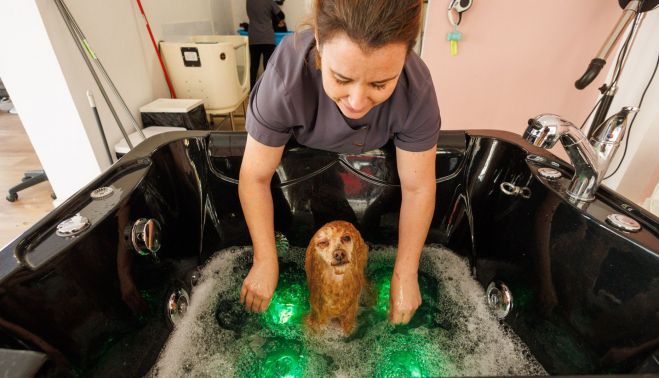 Llaman la atención las dimensiones de las instalaciones y también la numerosa presencia de mascotas desde primera hora de la mañana. Las causas de la presencia de los perros en el spa son tan variadas como las prestaciones del centro, que ofrece desde tratamientos de salud para la piel a otros que son estéticos. Potenciadores de color o baños de fonoterapia para perros que tienen algún tipo de patología e incluso acupuntura aparecen entre los servicios.