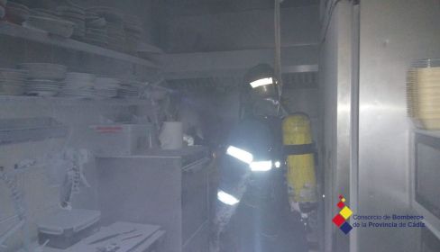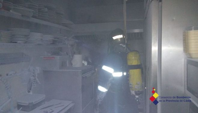 Bomberos del Consorcio de la Provincia en el parque de El Puerto de Santa María acudían en la noche de este miércoles a un incendio que se había producido en un local en el centro comercial Vistahermosa. En la cocina de una sidrería, el humo y las llamas ya salían por la chimenea cuando llegaron los bomberos.