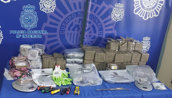 Los agentes llevaron a cabo la entrada y registro, de forma simultánea, en los domicilios de los investigados ubicados en Salamanca, procediéndose a la detención de los tres individuos por delitos contra la salud pública, falsificación de moneda y estafa continuada, y se intervinieron 53.757 gramos de hachís y 111,8 gramos de marihuana, así como dos básculas de precisión de la misma marca y una máquina para prensar el hachís en paquetes. Además, se intervinieron los sobres que empleaban para remitir contra reembolso los billetes falsificados y el hachís anunciado en las páginas web, 2.440 euros en efectivo, dos armas blancas prohibidas, herramientas idóneas para la comisión de robos con fuerza y varios terminales móviles.