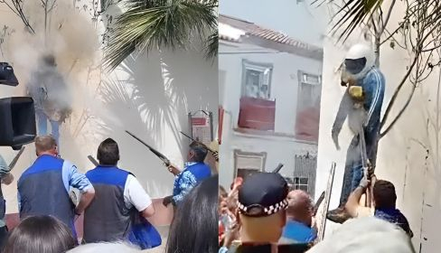 La figura del individuo en cuestión ha sido representada por un muñeco vestido con un mono azul y un cartel en el pecho que ponía "si te drogas, no conduzcas". En el hombro derecho llevaba un helicóptero y en la parte trasera tenía otro cartel con el nombre de Pegasus.
