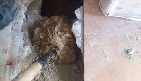 El jerezano relata que la solución que propusieron los profesionales fue “abrir boquetes por todo el piso para buscar y sacar todo lo que hay ahí metido”. Han pasado casi dos semanas desde que comenzaron los trabajos de arreglo. El atasco se complica y su madre no ha tenido más remedio que mudarse provisionalmente a la casa del hermano de Juan. Según dice, “llevan un montón de días liados, y ahora la porquería sale por los boquetes hacia el sótano”.