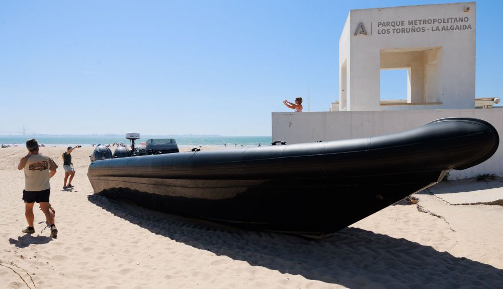 Resulta llamativa la escena. Personas, en bañador, cargando sombrillas o neveras, pasando por al lado de una goma que pudo ser utilizada para transportar kilos y kilos de droga. Varada en uno de los extremos de la playa, como si estuviera expuesta. Allí la han dejado las autoridades, a la espera de retirarla al depósito correspondiente.