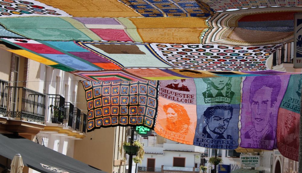 En la calle Ermita ya se introdujo una novedad el año pasado, con la instalación de paraguas revestidos de crochet. Este año, con idea de aprovechar ese material, se han unido las piezas. Por su parte, en la calle Málaga se instala por primera vez un tema específico, que hasta ahora no se había dado. La temática es 'Alhaurín de la Torre de cine'.