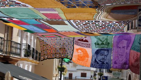 Es un gigantesco toldo colorido que se realiza desde el año 2019 con restos de telas y lanas, que elabora el taller de croché a partir de material reciclado, según informa el propio Ayuntamiento de Alhaurín de la Torre en redes sociales. Señala, asimismo, que debido a la alta demanda el próximo año tendrán que poner en marcha dos talleres.