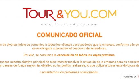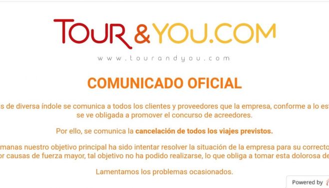 La web de la empresa recoge un breve comunicado en el que Tour and you detalla que cancela todos los viajes previstos. "En las últimas semanas nuestro objetivo principal ha sido intentar resolver la situación de la empresa para su correcto funcionamiento pero, por causas de fuerza mayor, tal objetivo no ha podido realizarse", explica sin más detalles.