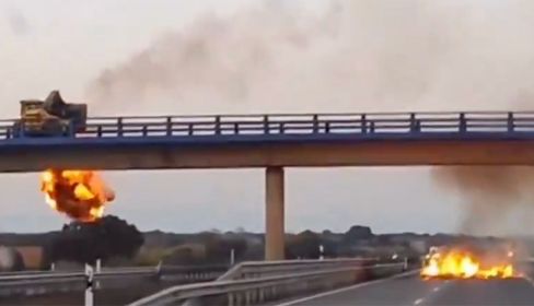 Las manifestaciones no autorizadas de los agricultores están sobrepasando líneas rojas en algunos casos. En el vídeo que aparece en esta publicación, que está circulando por redes, se puede apreciar cómo un tractor con retroexcavadora lanza una bola de fuego desde lo alto de un puente.