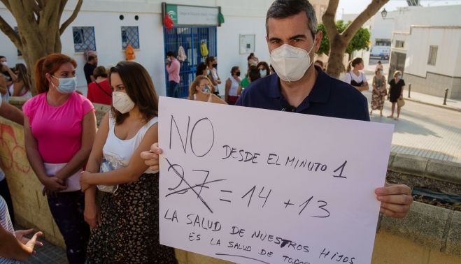 “No desde el minuto uno. 27=14+13. La salud de nuestros hijos es la salud de todos”, se lee en la pancarta que porta José Manuel Valderas, padre de uno de los 27 alumnos de una abarrotada clase de primero de Primaria del CEIP Blas Infante de Trebujena. Junto a él están las madres y padres de pequeños de primero y tercero, concentrados tras acudir a la llamada de la Ampa. Es la primera de una serie de movilizaciones que pretenden llevar a cabo para que la Junta de Andalucía autorice el desdoble de aulas y permita que se mantenga la distancia social. Ahora es imposible. El hijo de José Manuel no acudirá al centro escolar hasta que haya metro y medio de separación.