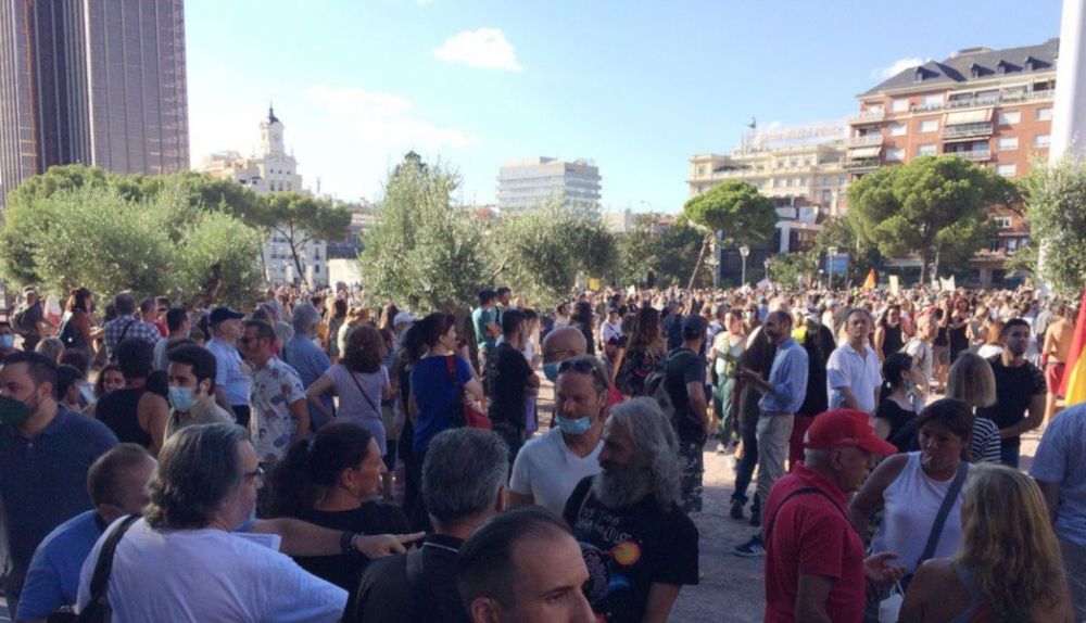 Un asistente a la manifestación contra las mascarillas en Madrid, en la plaza de Colón, que recelaba de las medidas de protección impuestas por el Gobierno para el control de la pandemia, se encuentra ingresado en un hospital de la capital con una neumonía causada por el coronavirus.