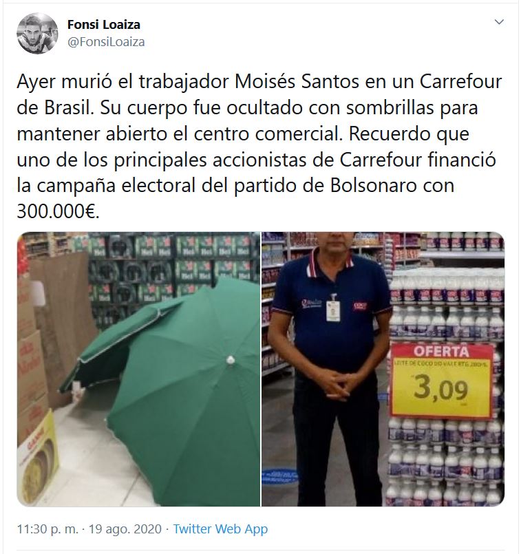 El trabajador, Moisés Santos, ha fallecido en una tienda de Carrefour de Recife, en Brasil, donde se dedicaba a la promoción de ventas, a causa de un ataque cardíaco. El establecimiento decidió ocultar el cuerpo del empleado con sombrillas en una esquina con el fin de poder continuar con sus puertas abiertas al público.