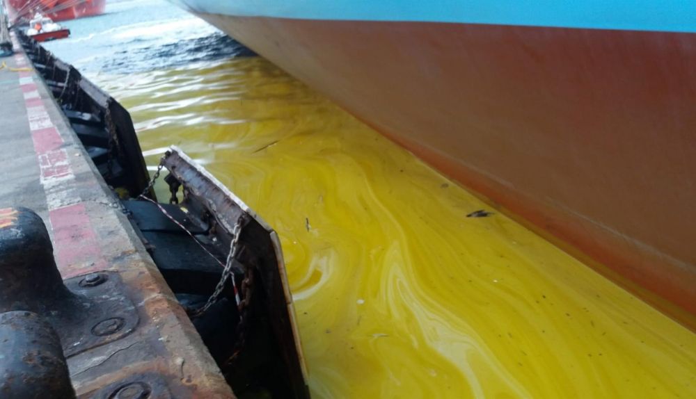 En una nota de prensa, el colectivo explicaba que por, sus propios medios, pudieron comprobar cómo los buques anticontaminación de la Autoridad Portuaria realizaban tareas de limpieza junto a estos portacontenedores, pues un producto oleoso había caído al mar en las descargas.