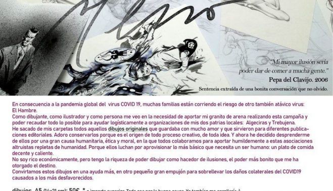 “Ya todo se hace de forma digital pero me gusta conservar los que hago a mano, es un archivo que con esta situación que hay ahora puede servir para ofrecer una pequeña gran ayuda”, explica a este medio el premiado artista, licenciado en Bellas Artes en la Universidad de Sevilla y diseñador gráfico y de animación. La acogida ha sido tal que en tan solo cuatro días ha conseguido más de 5.000 euros en donaciones, que tienen lugar directamente sobre los colectivos beneficiarios Trebujena Solidaria, gestionado por la Asociación de Mujeres Doña Palomares Oliveros y el comedor Padre Cruceiras, más conocido como el comedor Carmen-Cáritas, en la ciudad de Algeciras. “Estoy muy vinculado a Trebujena por mi parte paterna”, dice el dibujante, que es natural de esta localidad del Campo de Gibraltar y que ha decidido volcarse con sus dos “patrias locales” en los difíciles tiempos de la crisis del coronavirus.
