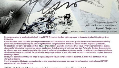 Ahora estos singulares dibujos llegarán por correo ordinario a personas de todas partes del país, con unos gastos de envío que él mismo asume al producirse la cantidad íntegra de la donación a unos colectivos que luchan para paliar las necesidades de los más desfavorecidos en tiempos de pandemia. "Como dibujante, como ilustrador y como persona me veo en la necesidad de aportar mi granito de arena", suscribe humildemente en el cartel. Desprenderse de sus trabajos artísticos es "por una causa humanitaria, ética y moral" en la que cree que todos debemos colaborar para "aprovisionar lo más básico que necesita un ser humano: un plato de comida decente y caliente".