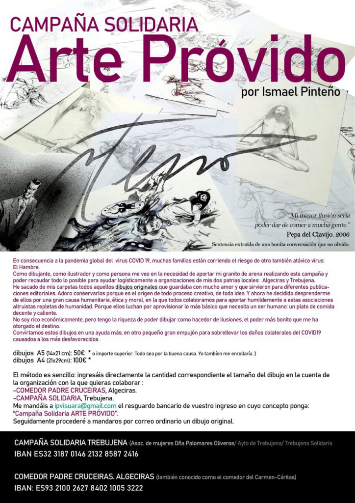 A través de redes sociales, el pasado fin de semana el ilustrador gaditano Ismael Pinteño, publicó una imagen en la que anunciaba una campaña solidaria llamada Arte Próvido. “Próvido es una palabra que se usa poco, pero viene de proveer que no es otra cosa que ayudar en todo lo posible a los demás”, explica a lavozdelsur.es por teléfono. El artista daba luz así a una iniciativa que llevaba pensando desde hace varios días al ver su archivo personal de bocetos y dibujos. “Esto lo puedo aprovechar yo”, se dijo a sí mismo. La idea que consistía en un trato con aquellos que le siguen —y aquellos que no, pero que quieren colaborar con la causa—: quien done 50 o 100 euros a uno de los colectivos solidarios que anuncia recibirá como contraprestación uno de sus dibujos originales.