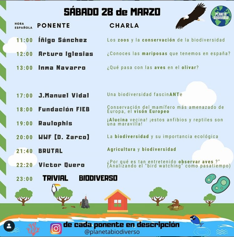 La cuenta Planeta Biodiverso (@planetabiodiverso) en Instagram ofrece información sobre los ponentes y las conferencias que imparten, que comienzan a las once de la mañana y concluyen sobre las once de la noche del viernes y el sábado 27 y 28 de marzo. “Hay una charla cada hora”, explica Álvaro Pérez, “pero son cortas para no atosigar, de unos 15 minutos, el resto del tiempo es para contestar preguntas”. La intención es que el público plantee sus dudas y se genere una conversación.